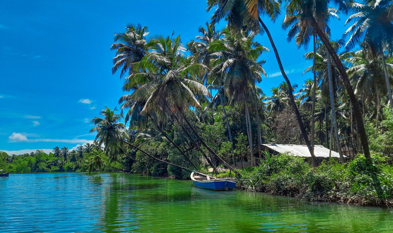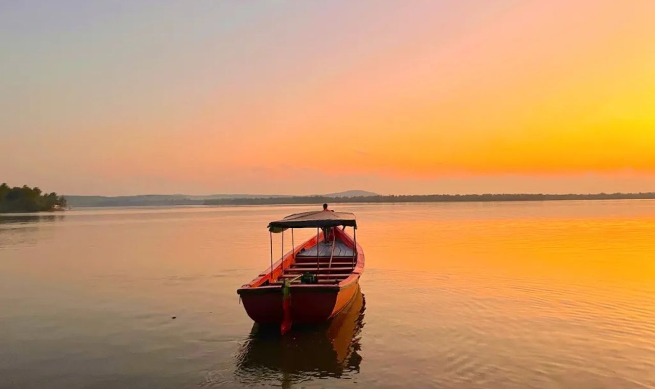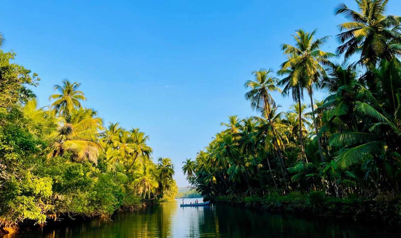 A traditional boat ride in Karnataka takes you through the serene Sharavati River backwaters surrounded by lush greenery.